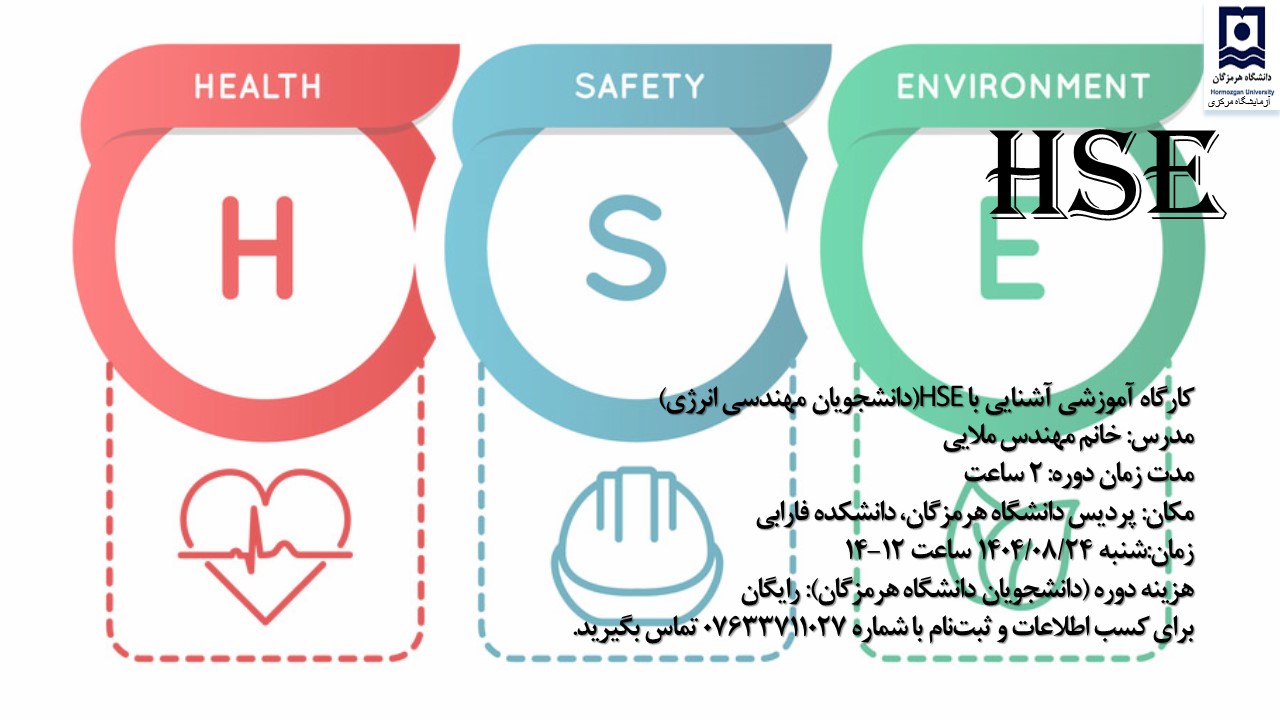در ادامه سلسله کارگاههای آموزشی ایمنی، آزمایشگاه مرکزی دانشگاه هرمزگان دوره HSE (ایمنی، بهداشت و محیطزیست) را این بار ویژه دانشجویان جدیدالورود رشته مهندسی انرژی برگزار میکند.